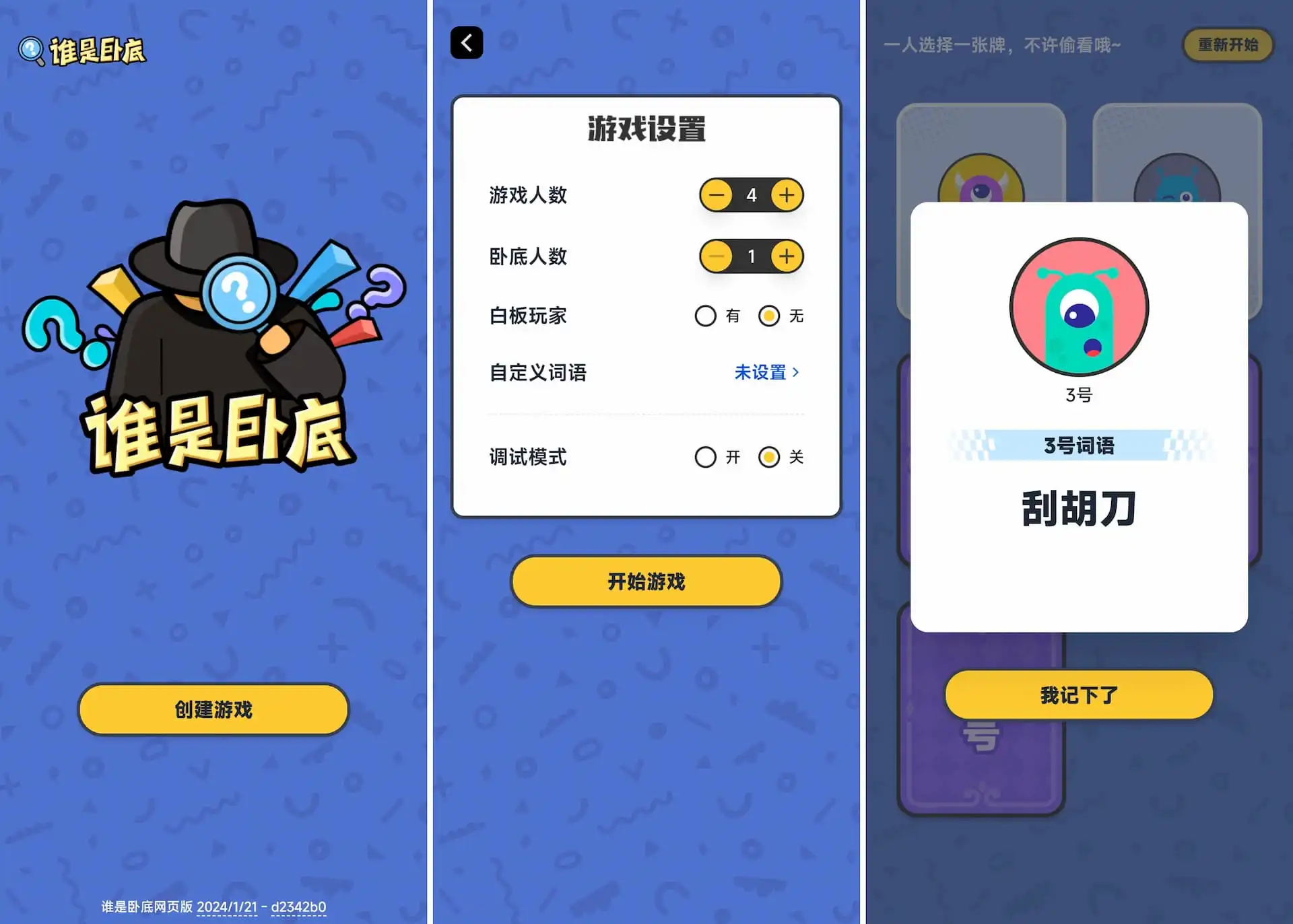 声明本网页设计素材源自《谁是卧底》手机应用,仅作个人练习使用,非商业用途。如有版权问题,请联系删除。原始链接:https://app.mi.com/details?id=com.moguplan.main一个网页版的谁是卧底小游戏。